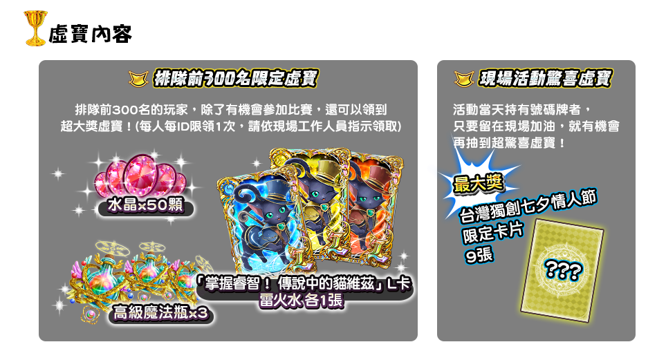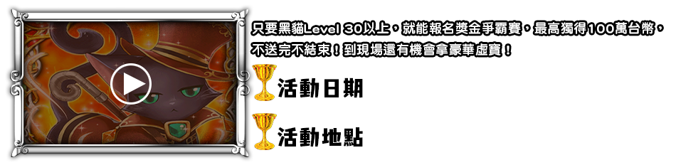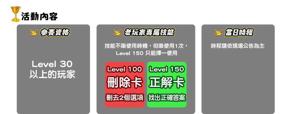 連續答對題數 獎金(新台幣) 當送出獎金累積達新台幣100萬後,活動即宣告結束,其餘持號碼牌但尚未參賽者,將無法繼續參賽。但即使獎金已送出99萬,下一名參賽者仍然可以拿到對應之獎金! 1題 500元 2題 1000元 3題 1500元 4題 3000元 5題 5000元 6題 7000元 7題 10000元 8題 15000元 9題 30000元 10題 50000元 11題 100000元 12題 150000元 13題 250000元 14題 500000元 15題 1000000元